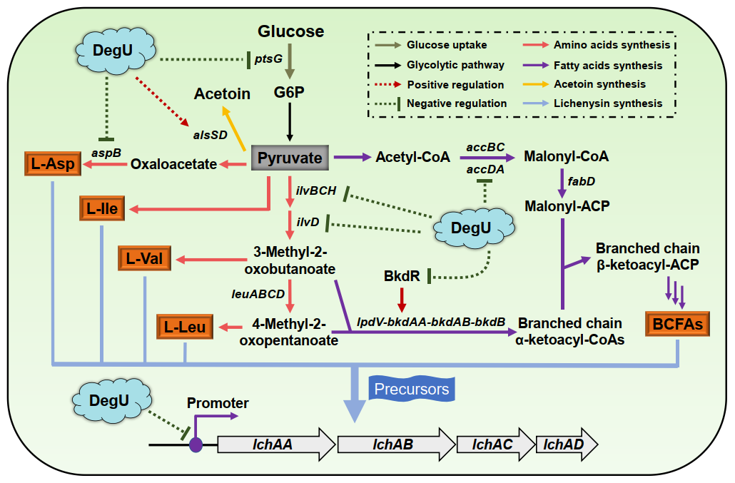 陈守文教授团队发掘了地衣素合成酶的关键抑制因子——转录因子DegU,并通过在地衣芽胞杆菌WX-02中敲除degU基因将地衣素产量提高了13.6倍,达到2.18±0.03 g/L。本团队还首次通过13C代谢流分析,系统地探究了转录因子DegU调控地衣素合成的代谢网络(图2)。实验证明,转录因子DegU负调控葡萄糖摄取,支链氨基酸和脂肪酸合成的相关基因的表达并正调控溢流代谢产物——乙偶姻的合成基因簇alsSD的表达。本研究不仅有助于进一步通过代谢工程改造提高地衣素的产量,也为研究转录因子调控产物合成提供了思路。并且本文首次报道的转录因子DegU对细胞碳氮代谢的调控网络也将为其他代谢产物高产提供基础。