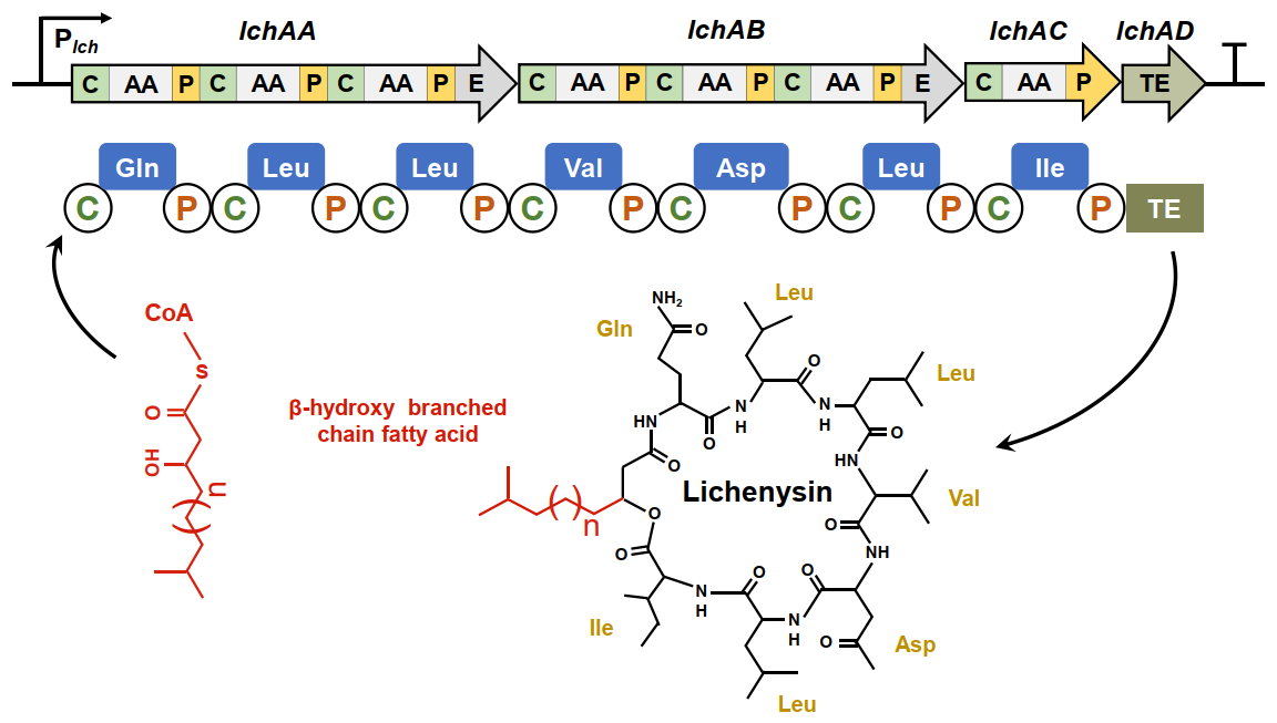 地衣素是地衣芽胞杆菌产生的一种重要的环状脂肽类生物表面活性剂,在石油开采、药物开发、农业生物防治和生物修复等方面具有广泛的应用。地衣素是一种典型的由非核糖体肽合成酶(NRPS)产生的次级代谢产物,由7个氨基酸的环肽和β-羟基支链脂肪酸缩合而成,具有双亲性(图1)。随着近几年国内外对NRPSs结构及蛋白质工程改造的深入研究,地衣素也将被赋予更多样的功能和应用方向。但与很多天然产物一样,地衣素的合成在其自然宿主菌中被抑制,这很大程度上限制着地衣素的合成调控研究及其大规模生产。