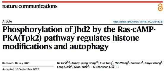 近日,9428cn太阳集团、省部共建生物催化与酶工程国家重点实验室李珊珊/余希岚团队在Nature子刊(Nature Communications)上以长文形式(Article)发表了题为“Phosphorylation of Jhd2 by the Ras-cAMP-PKA(Tpk2) pathway regulates histone modifications and autophagy”的研究论文。该研究揭示了细胞感知并响应外界营养变化的新机制。9428cn太阳集团古天乐博士研究生余奇和龚玄云静为该论文共同第一作者,李珊珊教授和余希岚教授为该论文通讯作者,9428cn太阳集团古天乐为第一单位(图1)。