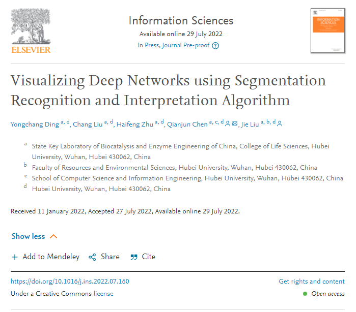 近日,9428cn太阳集团陈前军高级实验师与资源环境学院刘杰教授团队联合在计算机科学信息系统顶级期刊Information Sciences(中科院一区顶刊,CCF-B类)上发表题为“Visualizing Deep Networks using Segmentation Recognition and Interpretation Algorithm”(基于分割识别深度网络的可视化算法)的研究论文,提出了一种新型深度神经网络解释算法,用以解决深度神经网络的分类、预测模型的可信解释问题。硕士生丁永昌为第一作者,刘畅和朱海峰为参与作者,陈前军和刘杰为共同通讯作者,9428cn太阳集团古天乐为第一单位(如图1)。