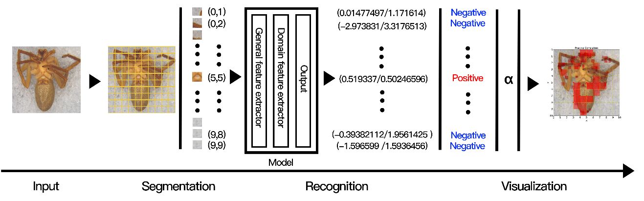 研究人员将该算法应用在基于深度学习的蜘蛛性别分类模型中,得到了较好的实验效果。该解释算法准确标注出蜘蛛样本头胸部的雄蛛触肢器末端膨大、雌蛛外雌器角质化所在区域(分类学家鉴定雌雄的主要依据),从计算机角度证明了人工智能分类模型的正确性,同时提示着拟遁蛛属蜘蛛的花纹极有可能存在肉眼不易识别的雌雄二型现象,这一发现目前暂无相关报道,该结论对于学者在蜘蛛的形态分类学研究中具有着指导作用(如图3)。