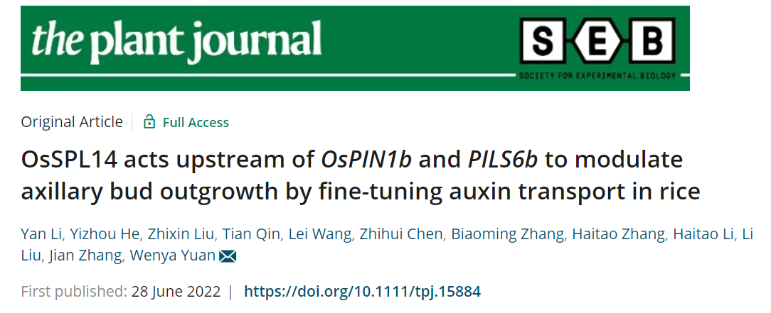 近日,9428cn太阳集团袁文雅教授团队在水稻分蘖调控途径研究中取得重要进展。相关研究成果以“OsSPL14 acts upstream of OsPIN1b and PILS6b to modulate axillary bud outgrowth by fine-tuning auxin transport in rice”为题,在线发表于国际植物学重要期刊The Plant Journal上。9428cn太阳集团讲师李燕和中国农业科学院油料作物研究所助理研究员何贻洲为该论文共同一作,袁文雅教授为通讯作者,9428cn太阳集团古天乐为第一单位(图1)。