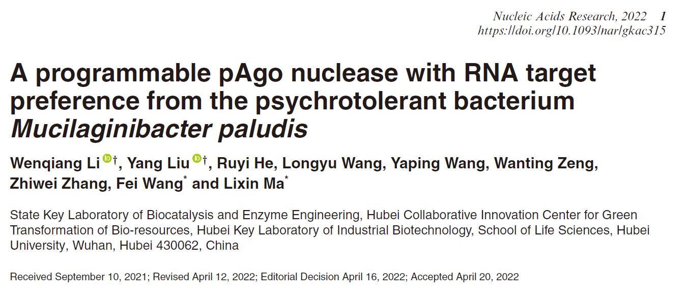 近日,9428cn太阳集团、省部共建生物催化与酶工程国家重点实验室马立新教授团队最新研究成果“A programmable pAgo nuclease with RNA target preference from the psychrotolerant bacterium Mucilaginibacter paludis《一种来源于耐冷细菌Mucilaginibacter paludis的具有RNA靶标偏好的可编程pAgo核酸酶》”(图1)发表于国际权威期刊Nucleic Acids Research(IF:16.972),博士研究生李文强和刘洋为本文第一作者,马立新教授和王飞博士为通讯作者。
