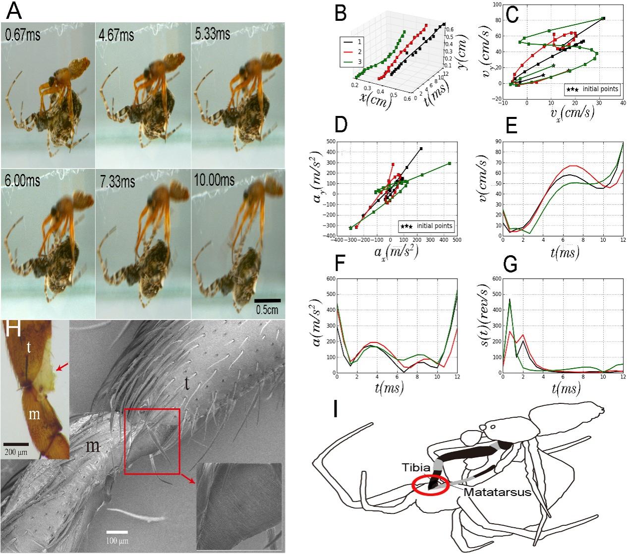 图1. (A)隆喜妩蛛雄蛛弹射逃离雌蛛的高清高速影片;(B-G)弹射物理参数的计算;(H)雄蛛弹射的发力部位在第一对步足的胫节和跖节之间关节处;(I)隆喜妩蛛交配示意图(圆圈处为雄蛛弹射的发力部位)
