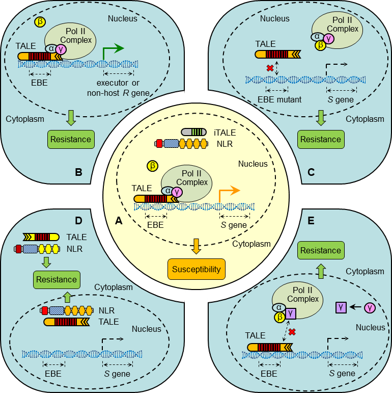 图1,TALE参与病原菌与植物互作的图示。A,TALE诱导宿主感病基因表达造成植物感病。B,宿主捕获TALE诱导抗病基因表达从而产生抗病。C,宿主感病基因启动子突变,破坏TALE的结合,引起植物抗病。D,宿主产生NLR蛋白识别TALE从而产生抗病反应。E,宿主基本转录起始复合体成员突变,不与TALE结合,造成植物抗病。