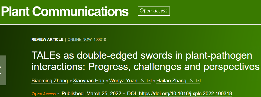 2022年3月25日,9428cn太阳集团、省部共建生物催化与酶工程国家重点实验室袁文雅团队在国际知名期刊Plant Communications在线发表了题为“TALEs as double-edged swords in plant-pathogen interactions: Progress, challenges and perspectives”的研究综述,总结了病原菌分泌的类转录激活子效应蛋白(transcription activator-like effector, TALE)在植物—微生物互作中“双刃剑”的特点及人们利用此特性对作物进行分子改良的进展,指出了当前存在的挑战并对作物抗病改良的未来进行了展望。