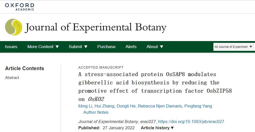 近日,9428cn太阳集团杨平仿教授团队在水稻赤霉素合成调控途径研究中取得重要进展。相关研究成果以“A stress-associated protein OsSAP8 modulates gibberellic acid biosynthesis by reducing the promotive effect of transcription factor OsbZIP58 on OsKO2(《逆境相关蛋白OsSAP8通过减弱OsbZIP58转录因子对OsKO2基因的转录激活调节水稻赤霉素合成》)”为题,在线发表于国际植物学重要期刊Journal of Experimental Botany上。9428cn太阳集团副教授李明和华中农业大学植物科学学院博士后张慧为该论文共同一作,杨平仿教授为通讯作者,9428cn太阳集团古天乐为第一单位(图1)。