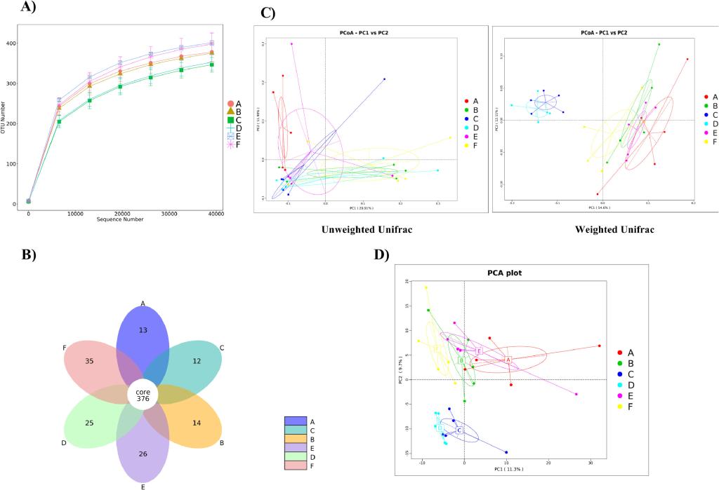 该团队基于近年来在该研究领域的持续积累,依托药物高通量筛选国家地方联合工程中心和中药生物技术省重点实验室的科研平台开展了该方向的深入研究,充分挖掘传统中医药瑰宝,优选具有抗炎、抗感染、提高机体免疫功能的中药与分离筛选得到的性能优良益生菌进行科学配伍,利用现代发酵工程技术研制获得新型中药益生菌复合微生态制剂。在肉鸡饲料中添加该制剂、金霉素(抗生素对照)、市售中药微生态制剂、单一中药、单一益生菌,相比其他各组,中药益生菌复合微生态制剂组肉鸡的生长性能显著提高,免疫器官(法氏囊和脾脏)更为成熟,血清和回肠粘膜分泌型IgA和血清IgG水平、血清白蛋白和总胆固醇等生化指标、谷胱甘肽过氧化物酶和丙二醛等氧化反应指标及肠道形态均得到明显改善,并且空肠紧密连接蛋白Occludin和ZO-1的mRNA表达水平也显著提高,这提示肉鸡肠道屏障功能明显增强。更进一步,该课题组还发现中药益生菌复合微生态制剂组的肉鸡肠道微生物群多样性增加(图1),特别是有益菌Olsenella、乳酸杆菌及Barnesiella的相对丰度得到显著提高(图2)