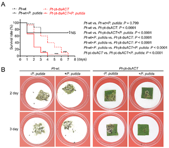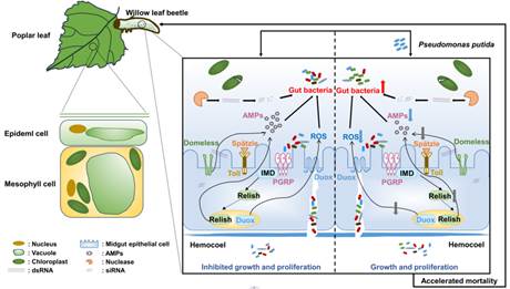 通过叶面涂抹肠道细菌P. putida能够加速PM-RNAi致死柳蓝叶甲。与细胞核转基因杨树植株相比,质体转基因杨树植株质体中能够积累大量的长链dsRNA。这些长链dsRNA被幼虫取食后,会使其体内靶基因的表达被沉默从而导致幼虫死亡。此外,与未涂抹P. putida的质体转基因杨树叶片相比,当喂食涂抹了P. putida的质体转基因杨树叶片时,幼虫的肠道发生破裂,导致肠道中的肠道细菌从肠腔转移到血腔,而幼虫体内与产生抗菌肽和活性氧相关的基因的表达水平被显著下调,限制了幼虫抑制体内肠道细菌过度生长的能力,使肠道细菌发生紊乱,从而加速质体介导的RNAi致死柳蓝叶甲(图4)。
