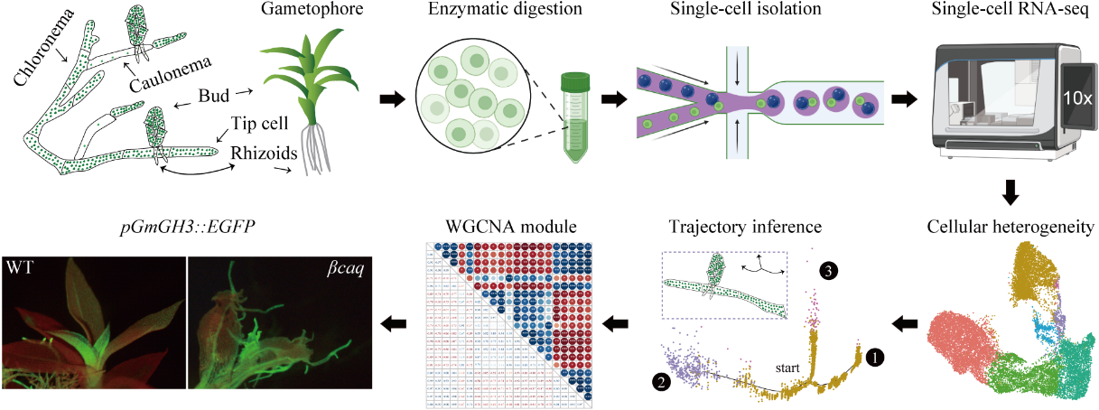 因此,本研究利用单细胞RNA测序技术来分析其形态发生的异质性,包括2D细丝(绿丝体和轴丝体)和3D结构(芽和配子托)。通过伪时间分析模拟了2D到3D生长转变的发育轨迹,并揭示了许多可能决定3D芽细胞分化命运的候选基因。利用WGCNA分析,本研究确定了一个将β型碳酸酐酶(βCA)与生长素连接起来的共表达模块。后续进一步体内验证了βCA的细胞表达模式,并证明了它们在3D配子托发育和生长素途径中的作用。该研究对小立碗藓的细胞异质性提供了见解,并鉴定了单细胞分辨率下2D到3D生长的分子特征,为未来的研究提供了重要资源。