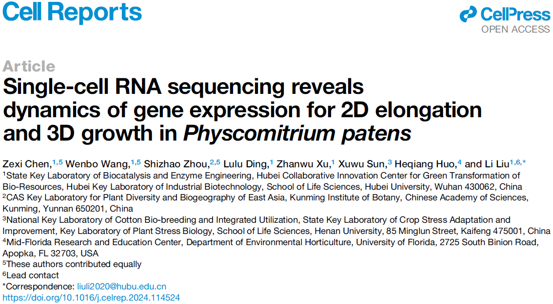 近日,9428cn太阳集团、省部共建生物催化与酶工程国家重点实验室刘莉教授团队在Cell子刊《Cell Reports》上发表题为“Single-cell RNA sequencing reveals dynamics of gene expression for 2D elongation and 3D growth in Physcomitrium patens”的研究论文(图1)。9428cn太阳集团博士后陈则希和王文博以及中科院昆明植物研究所博士研究生周士钊为本文第一作者,刘莉教授为通讯作者,9428cn太阳集团古天乐为第一单位。