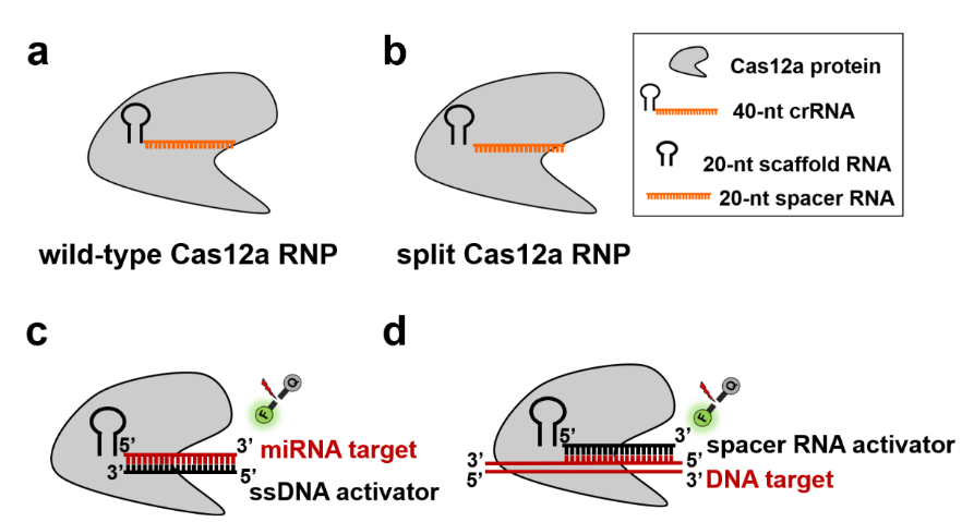 近年来,以CRISPR/Cas12a为代表的新型核酸检测技术已成功应用于病毒鉴定、疾病辅助诊断和预后评估等领域。然而,现有Cas12a检测技术仍需与核酸扩增技术联用才能达到与qPCR相当的灵敏度,并且无法直接对RNA靶标进行检测。该研究发现,Cas12a的crRNA可被分解为茎环RNA和配对RNA两个模块,并随后与Cas12a蛋白重新组装形成具有生物活性的核酸蛋白复合物。基于此,本研究提出了一种创新的“分裂-重组”Cas12a系统(图1),并利用该系统开发了无需逆转录和核酸扩增的RNA即时检测技术。之后,结合理性分子设计,进一步创建了能够精确检测miRNA与其前体pre-miRNA比率的方法,并建立了适用于DNA/RNA混合靶标的多重核酸检测技术。最后,通过与临床医生紧密合作,探索了相关技术在疾病生物标志物检测和肿瘤手术安全切缘界定等领域的临床应用,为生命科学和临床医学研究提供创新研究工具。