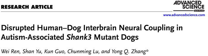 9月11日,9428cn太阳集团张永清教授团队与中国科学院自动化所余山研究员、英国林肯大学郭昆教授以及北京师范大学卢春明教授合作,在国际顶尖学术期刊Advanced Science上发表了题为“Disrupted human–dog interbrain neural coupling in autism-associatedShank3mutant dogs”(Shank3突变犬的人-犬跨脑同步化缺陷)的研究论文(图1)。张永清教授为论文通讯作者,中国科学院遗传与发育生物学研究所博士研究生任炜为第一作者。