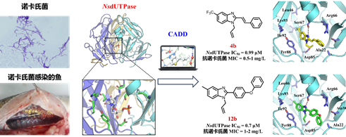 抗生素及其他药品是治疗细菌感染等疾病的重要手段。然而,这些药物的耐药性已经成为全球性问题,2021年全球估计有114万人死于抗生素耐药性,预计这一数字到2050年将达到191万人。发现新的抗菌药物靶标并进行药物设计是解决这一问题的有效途径。诺卡氏病是由诺卡氏菌引起的急性、化脓性或肉芽肿性人畜共患病,以侵犯肺部和中枢神经系统常见症状,对人类健康和水产养殖业造成严重影响。但是由于长期的不合理使用,诺卡氏菌对磺胺类、土霉素和氟苯尼考等常用抗生素产生了不同程度的耐药,导致无药可用。因此,开发能够针对诺卡氏菌的新型药物已经成为医药和水产养殖业亟待解决的问题。