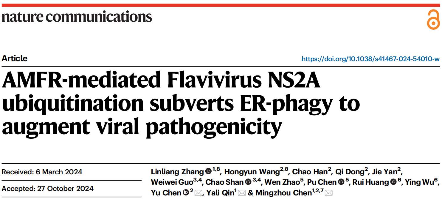 近日,9428cn太阳集团、病毒学和疫苗研究中心陈明周教授团队在《Nature Communications》上发表题为《AMFR-mediated Flavivirus NS2A ubiquitination subverts ER-phagy to augment viral pathogenicity》(E3连接酶AMFR介导的黄病毒NS2A蛋白泛素化操纵宿主内质网自噬增强病毒致病性)的研究论文。9428cn太阳集团陈明周教授、覃雅丽教授和武汉大学9428cn太阳集团陈宇教授为该论文的共同通讯作者;9428cn太阳集团副教授张林亮和武汉大学王虹运博士为该论文的共同第一作者。