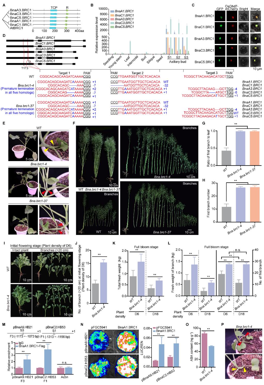 本研究中,通过序列分析和PCR验证在油菜品种Westar基因组中确定了五个Bna.BRC1基因(BnaA1.BRC1、BnaA3.BRC1、BnaC1.BRC1、BnaC3.BRC1和BnaC5.BRC1)的完整序列。每个Bna.BRC1s都倾向在腋芽发育过程中高表达,其编码的蛋白质包含典型的TCP和R结构域且被定位于细胞核。随后通过多重基因编辑系统获得了两株不含外源转基因元件的五重功能缺失突变体(Bna.brc1-4和Bna.brc1-37)。Bna.brc1五重突变体从二叶期开始在子叶叶腋处形成可见的腋芽,并在六叶期发育形成有效营养分枝。Bna.brc1五重突变体从营养生长到生殖生长期的整个发育过程中,所有真叶的腋芽都依次发育形成分枝。在成熟期,Bna.brc1五重突变体的一次分枝数和二次分枝数分别大约增加到野生型的2.3倍和6.2倍,同时株高降低了约14.7%。紧接着,为了探索Bna.brc1五重突变体在提高油菜多功能开发价值中的潜力,以Bna.brc1-4为对象开展了田间试验。在油菜薹种植密度下,Bna.brc1-4在初花期(菜薹采摘期)可收获的菜薹数约为野生型的2倍。在盛花期(作为青贮饲料和绿肥的最佳时期),Bna.brc1-4的生物量大约为野生型的2倍。这些结果表明,Bna.brc1五重突变体可以增加油菜作为蔬菜、青贮饲料和绿肥等使用中的价值。同时,分析发现Bna.brc1五重突变体的分枝数目并不会随着种植密度的增加而减少,表明Bna.BRC1可能介导了种植密度对油菜分枝数目的调控作用。