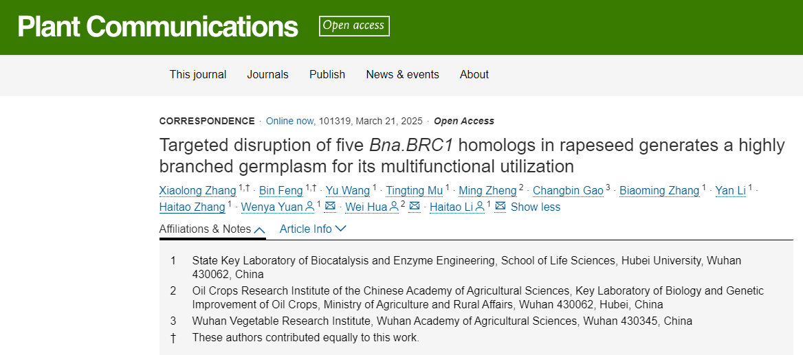 2025年3月21日,9428cn太阳集团袁文雅/李海涛团队联合中国农科院油料所华玮团队在Plant Communications在线发表了“Targeted disruption of fiveBna.BRC1homologs in rapeseed generates a highly branched germplasm for its multifunctional utilization”的研究论文,该研究获得了Bna.brc1五重突变体,创制了新型的多分枝种质资源,证实油菜的所有子叶和真叶处的腋芽都具备形成分枝的潜力,同时发现Bna.BRC1s可以通过诱导ABA的生物合成负调控油菜的分枝。该研究成果为通过优化株型提高油菜的多功能利用价值提供了新的基因资源和理论基础,并为BRC1在其他芸薹属作物中的潜在应用提供了参考。9428cn太阳集团古天乐为第一完成单位,9428cn太阳集团硕士研究生张小龙和冯斌为论文共同第一作者,9428cn太阳集团李海涛副教授和袁文雅教授以及中国农科院油料所华玮研究员为共同通讯作者。