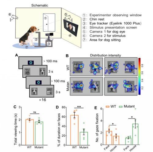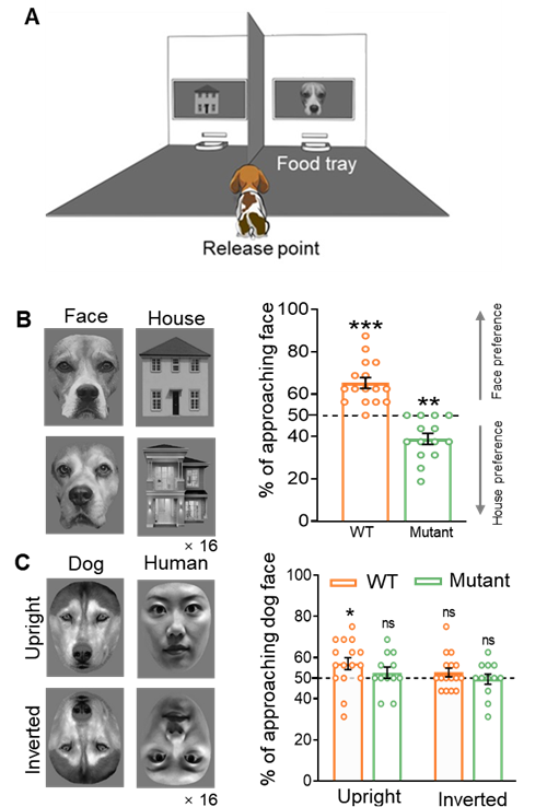 图1:Shank3突变犬偏好房子,而野生型犬偏好面孔;野生型犬偏好同类面孔,而突变犬没有这种偏好