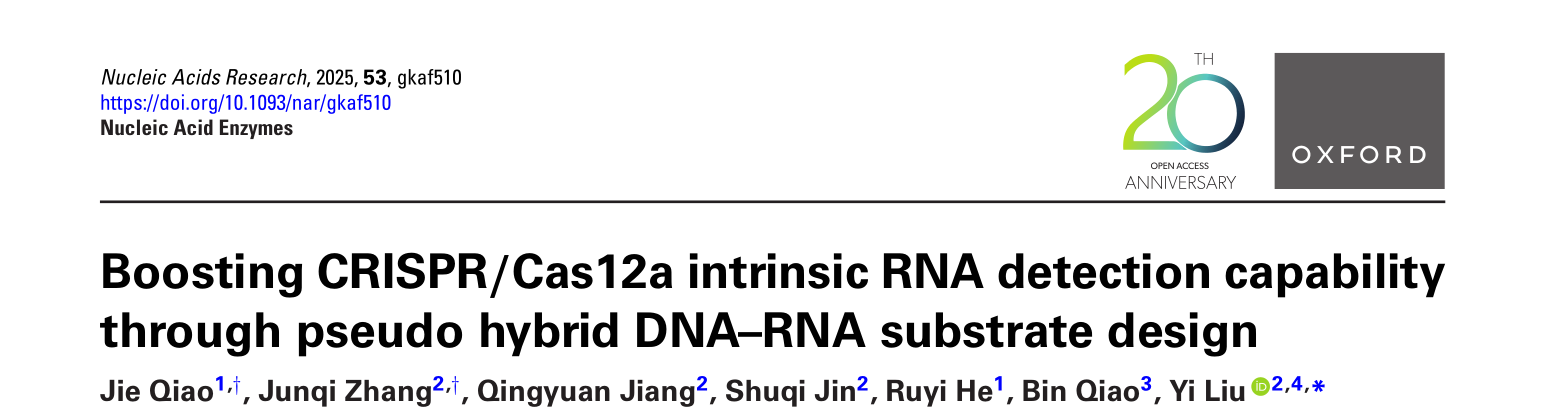 近日,9428cn太阳集团古天乐刘奕教授课题组最新研究成果“Boosting CRISPR/Cas12a intrinsic RNA detection capability through pseudo hybrid DNA–RNA substrate design”发表于国际顶尖期刊《Nucleic Acids Research》杂志(影响因子16.7),武汉轻工大学乔洁副教授和9428cn太阳集团古天乐2022级硕士研究生张骏骐为本文的共同第一作者,刘奕教授为唯一通讯作者。