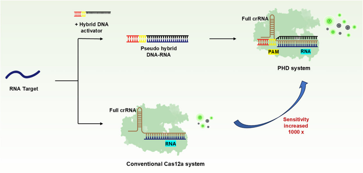 传统CRISPR/Cas12a系统虽被誉为 “基因剪刀”,但其RNA检测能力长期存在灵敏度低(仅3 - 30 nM)、难以识别短于20 nt的RNA片段或复杂结构RNA、需依赖逆转录等繁琐预处理步骤三大瓶颈。现有升级技术难以兼顾灵敏度与普适性,限制了其临床应用。