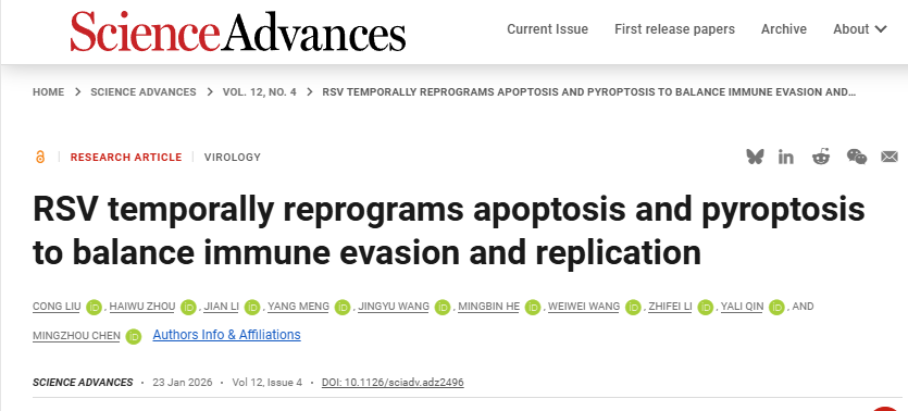 近日,9428cn太阳集团病毒学和疫苗研究中心陈明周教授团队继续在呼吸道合胞病毒(RSV)的机制研究中取得新的突破,在Science子刊《Science Advances》上发表了题为“RSV Temporally Reprograms Apoptosis and Pyroptosis to Balance Immune Evasion and Replication”的研究论文。该研究系统阐明了呼吸道合胞病毒(RSV)在感染不同阶段对细胞凋亡与细胞焦亡时空动态调控机制,揭示了程序性细胞死亡过程的时序性调控在呼吸道合胞病毒复制、传播及宿主炎症反应中的关键作用。