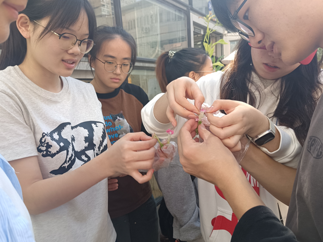 活动一开始,同学们通过研究生常江的帮助,将人工培育的烟草植株从温室中搬至室外,以便进行观察学习。在老师的讲解与指导下,同学们观察并触摸烟草的叶片与花朵,学习烟草如何利用其粘性腺毛进行防御自卫,它的花朵具有什么样的特征,以及可育花和不育花形态上有什么特点等知识,学生分小组积极观察与讨论,对烟草进行了详细的考察。