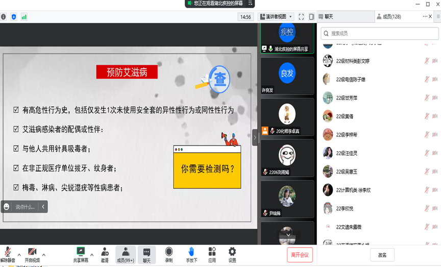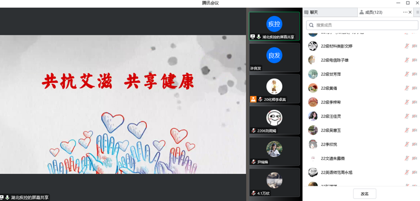 当天下午6时,线上专题知识讲座吸引了近150名同学参加。来自湖北省疾病预防控制中心、湖北健康教育所促进部主任、副主任医师马丽娜做了防艾知识的宣讲,9428cn太阳集团古天乐健康俱乐部会长、2021级休闲体育专业学生曹鹏,9428cn太阳集团古天乐集邮与收藏协会会长、2020级化学(师范类)专业学生李卓真等作为嘉宾参加了宣讲。活动由9428cn太阳集团古天乐全国青春健康高校项目组负责人、健康俱乐部指导老师、集邮与收藏协会指导老师许良发主持。