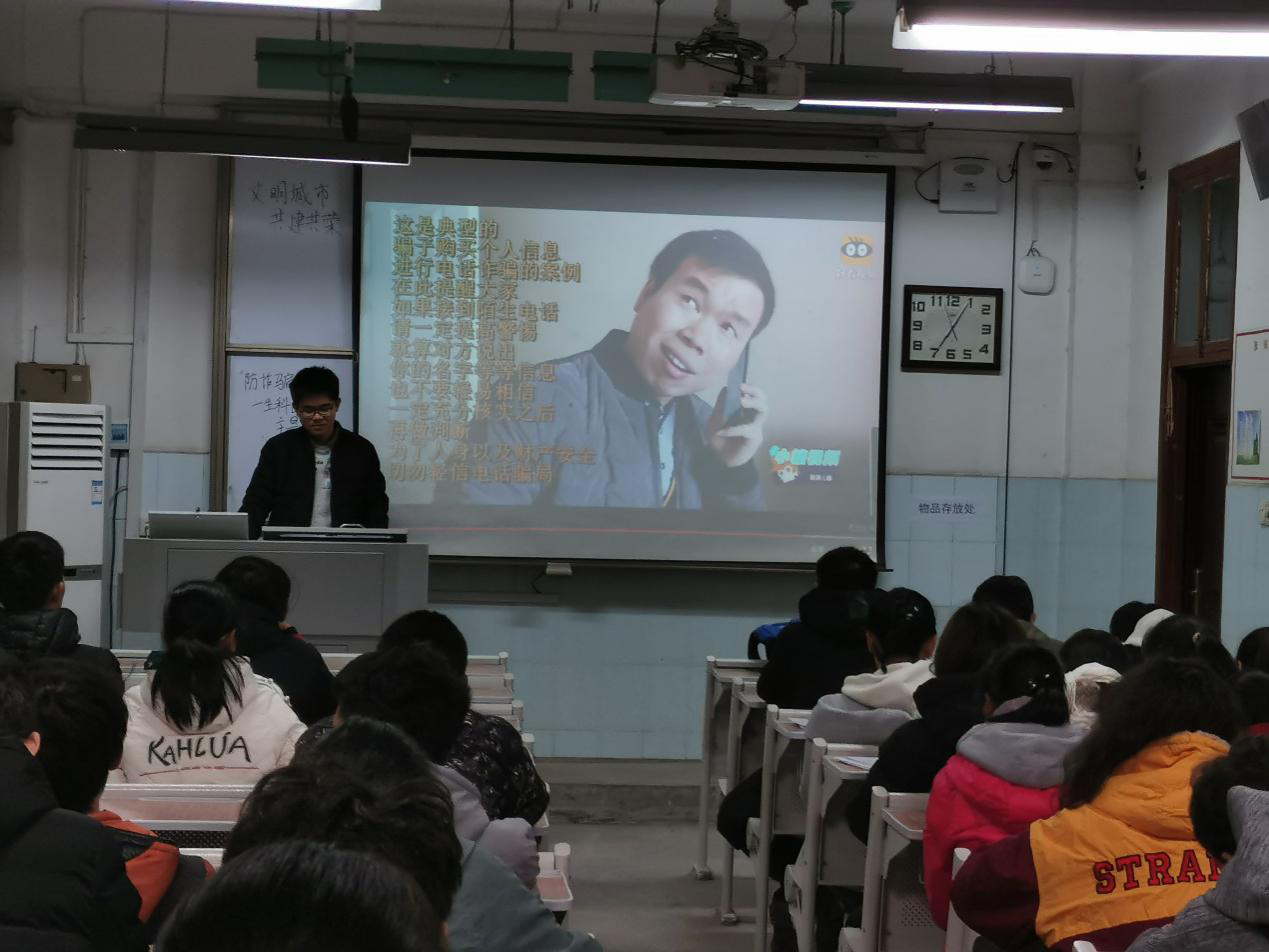 班会开始时,班长先向同学们介绍了在现代社会中比较常见的几种诈骗方式:冒充公检法、熟人、领导、网站工作人员等。之后,他为同学们播放了一种最典型的冒充领导诈骗的视频,借此提醒同学们要谨慎面对各种陌生信息,提高警惕。紧接着班长同学们展示了几诈骗案例这些案例中,大多数受害者都是因为怀抱着“占便宜”的心思上当受骗的还有一部分人,明知被骗,还甘愿受骗班长说道:“大家心中不要觉得有些骗人者可怜,其实他们正是利用大家的同情心来骗人的。