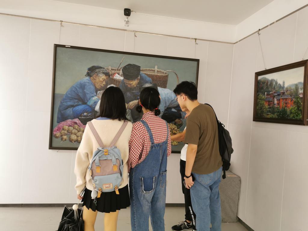 首先,17生师班全体成员于晚上7点在艺术学院门口集合,一起参观艺术学院“不忘初心、牢记使命”庆祝新中国成立七十周年主题作品展。进入展厅后,同学们对绘画作品进行观赏并互相交流。其中,有同学惊叹油画作品的色彩美丽,也有同学关注到这些画作记载的新中国成立以来的历史变迁。