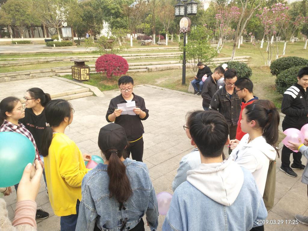 最后,大家排成两排,抛起气球合影留念,本次团日活动圆满结束。“这次活动让我意识到‘五·四’这个节日的重要性,有很多知识只是以前听说过但是并没有有意去了解,很感谢这次活动给我更多了解历史的机会。”17生科A班学习委员谭娉婷如是说道。(摄影:毛艾佳)