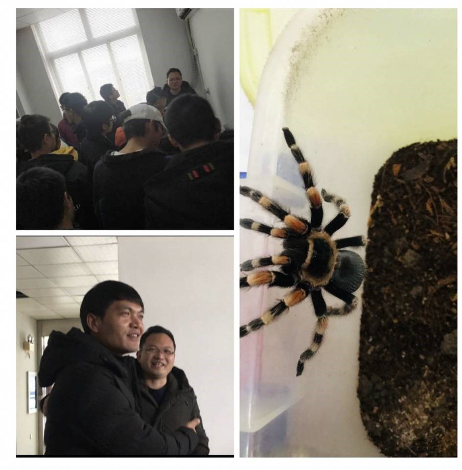 接着,两位教授带领同学们参观了养蛛室,介绍了这里的各种蜘蛛,有以吃鸟著称的墨西哥火脚蜘蛛,有名字瘆人的幽灵珠,还有大眼萌萌的跳蛛……张教授对这些小东西们可谓如数家珍,了解他们每一种的习性特点。他也提及有一次手痒,想摸一下“宝贝”,结果被咬了一口,差点去医院了。就这样在张教授专业又不失风趣的讲解下,同学们对这些蜘蛛的了解大大加深。“通过这次实践,让我了解到科学离我们并不遥远,要善于见微知著,陈教授和张教授就是那种‘闻一推十,旧雨知新’的人,我要向他们学习。”杨天同学在活动结束后说到。