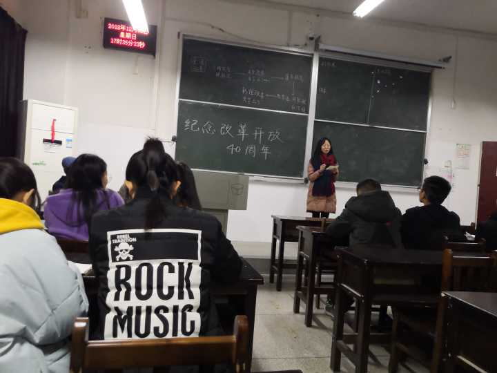 活动伊始,团支书陈小漫介绍了改革发展重要事件,她讲到了1978年中国共产党十一届三中全会的召开揭开了改革开放的序幕;1979年的经济特区的成立;1992年邓小平爷爷的重要南巡稳定了人民担忧的心,更是为中国走上有中国特色社会主义市场经济发展道路奠定了思想基础;还有2012年11月29日,习近平总书记把“中国梦”定义为“实现中华民族伟大复兴的梦想”。许多中国改革开放四十周年以来的重大事件都在这个环节重温回顾,得到新生。随后团支书陈小漫以问答的形式加深印象,每个人都能正确回答相关问题。同学们通过这两个过程,更加深入理解了改革开放是中国共产党在社会主义初级阶段基本路线的基本点之一最后全班学生共唱歌曲《春天的故事》,将1992年邓小平爷爷的南巡事件再次重温。