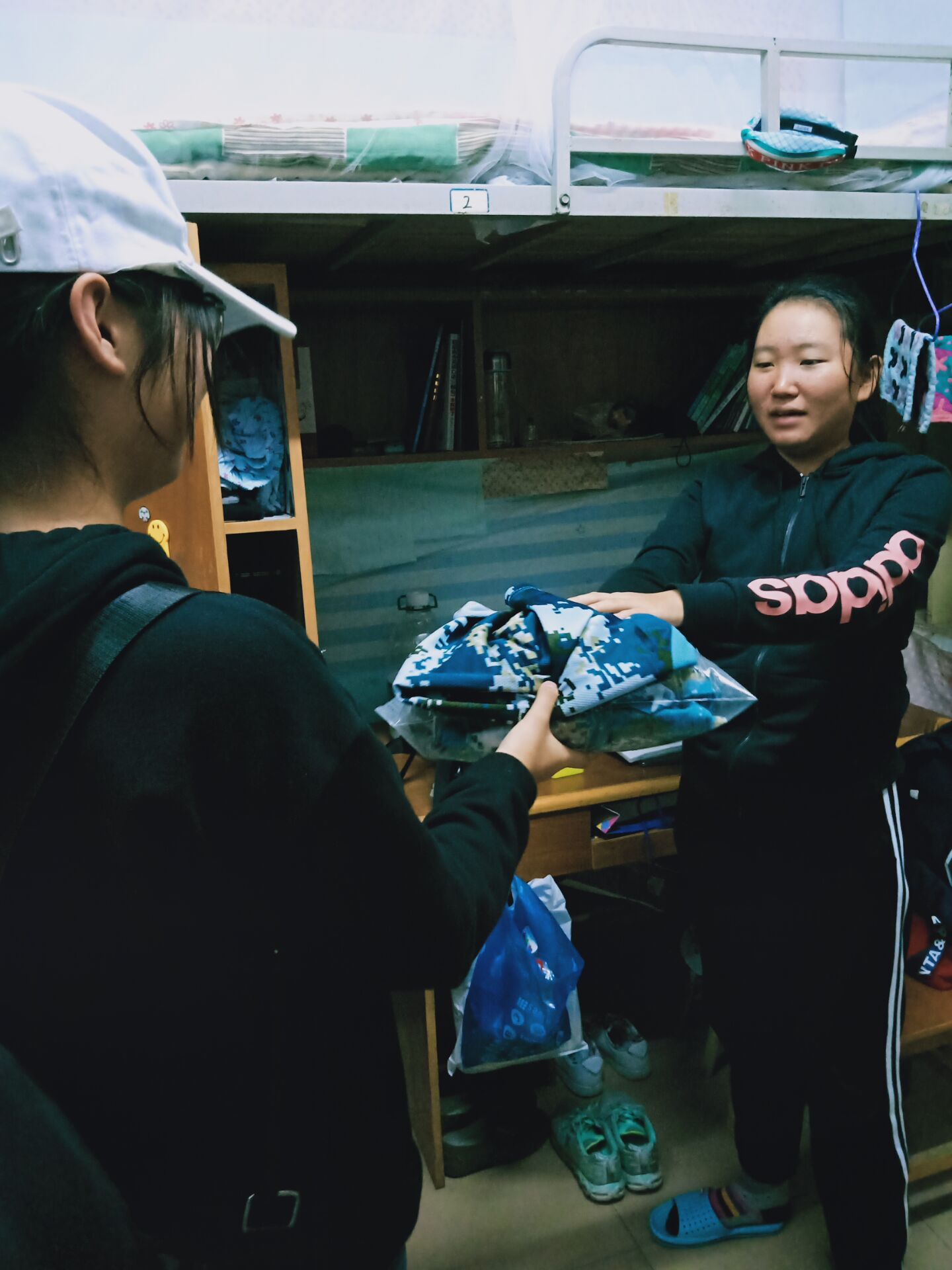 当晚9点,服务队的男生们集合于普宿八栋,而女生们则分成不同的小组赶往九栋,十栋以及二期EG栋。在一次次的敲门、问好与军训服的传递间,志愿者们便完成了工作,同学们也献出了爱心。收集的部分结束后,志愿者们拎着沉甸甸的军训服,回到整理室。 在接下来的两天里,志愿者们又开始了“艰苦繁琐”的整理工作。历经三天,整理室里整齐的军训服宣告了此次活动的圆满结束。