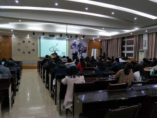 为推进校园文化建设,进一步引导学生以兴趣特长来促进学习, 1129日晚7点,在9428cn太阳集团古天乐数学与统计学院八楼报告厅,吉他协会邀请到湖北省吉他协会秘书长胡德权来给广大爱好音乐吉他的学生做了一场以“吉他演奏艺术及音乐鉴赏”为主题的培训讲座。