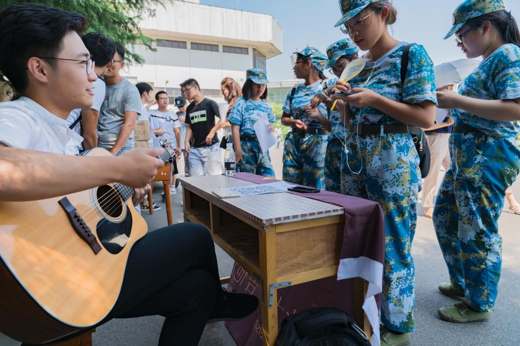 活动分为两个地点进行,前期是在大学生活动中心侧门旁边——军训场出口对面,11点半正是同学们军训结束的点,同学们鱼贯而出,此刻,吉他声在燥热的午后如指尖流音一般悠扬而来,吸引了不少同学的驻足。“学长,是扫这个二维码加群吗?”“学长,阳逻的以前的吉他协会跟现在是一样的吗?”“学长,不会弹吉他的可以加吗?”“是的是的,扫码加群,然后十月份的百团大战会正式进行教授,而且,加入我们协会的话,每周还有免费的教程……只要你热爱吉他,都可以加入我们协会。”吉他协会会长王森耐心回答着同学们的问题。后期活动在嘉会园,以同样的方式进行着宣传。
