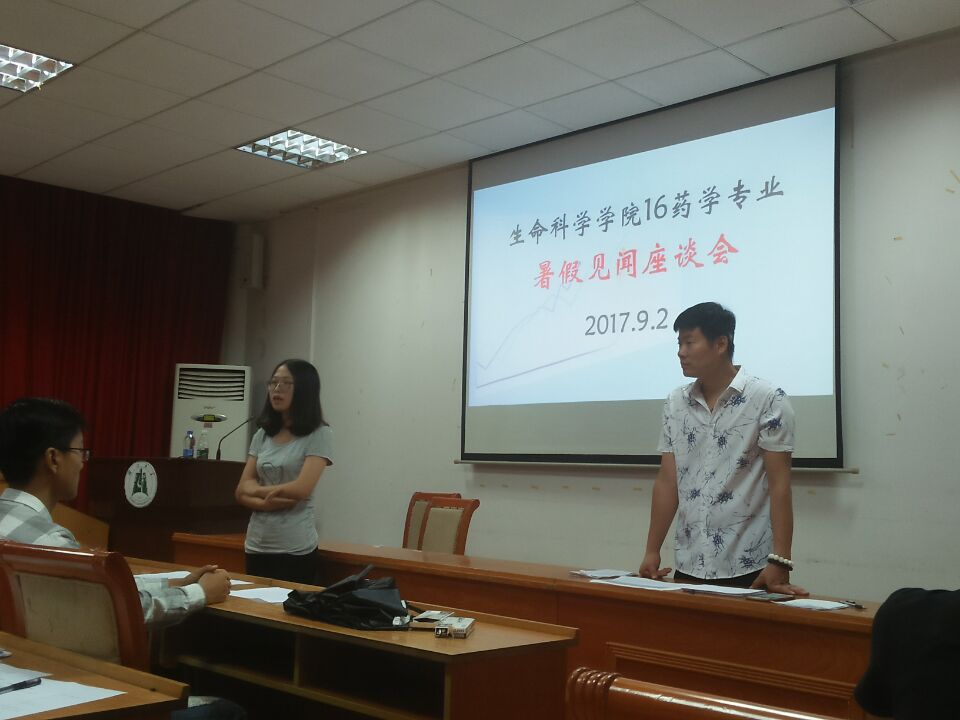 大一为期两月的缤纷暑期结束了。在这已然入秋的九月,同学们都纷纷回到了大学校园,为新学期的学习生活做起了准备。在九月二日下午五点,9428cn太阳集团2016级药学班专业的大家齐聚在生科院二报,在班主任许老师的带领下,进行了一场有意义的班会兼暑期见闻座谈会。