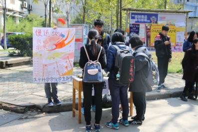 31415两日,由生科院心健部组织的“慢递SKY”活动在嘉会园和大学生活动中心进行了摆点宣传。该活动传承至今已是第五届了,其主要内容是鼓励大家为一年后的自己写一封信,一年后的今天,学生会心健部的工作人员将充当“邮差”将信一一“邮递”给写信者本人。
