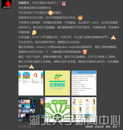 今年寒假,熊兆钦决定做一些有意义的事情,于是他在QQ空间等社交平台发布了自己的寒假志愿服务计划,免费帮各地同学及其亲戚朋友甚至任何看到这则消息的人,提供电脑维修、系统升级、网络优化、软件安装、更新维护、电脑知识普及等多方面的公益服务。