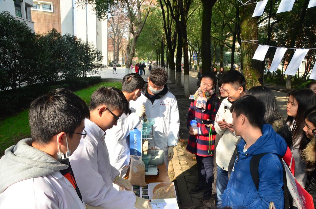 志愿者们现场为大家演示一粒米的“诞生”过程。他们用从生科院搬来了稻谷精米检测机、稻米垩白观测仪和精米机三台机器,经过将米的谷壳打掉,筛选精米、粗米和糠,将粗米再加工成精米三道工序,生产出大米成品。“米在两个高速转动的齿轮上互相摩擦碰撞脱掉谷壳的”志愿者杨子南将准备好的稻谷小心的放入机器中,经过三步工序,最后便出现大米便出现在干净的盘子里了。“咦?”靠的比较近的徐锦禾惊奇地说道:“这米,怎么有的和我在家里看到的不同啊。”引得不少同学纷纷近距离观察,也发出了同样的疑问。“这个棕色的米是什么呀?”“这个能吃吗?”大家七嘴八舌地议论着。