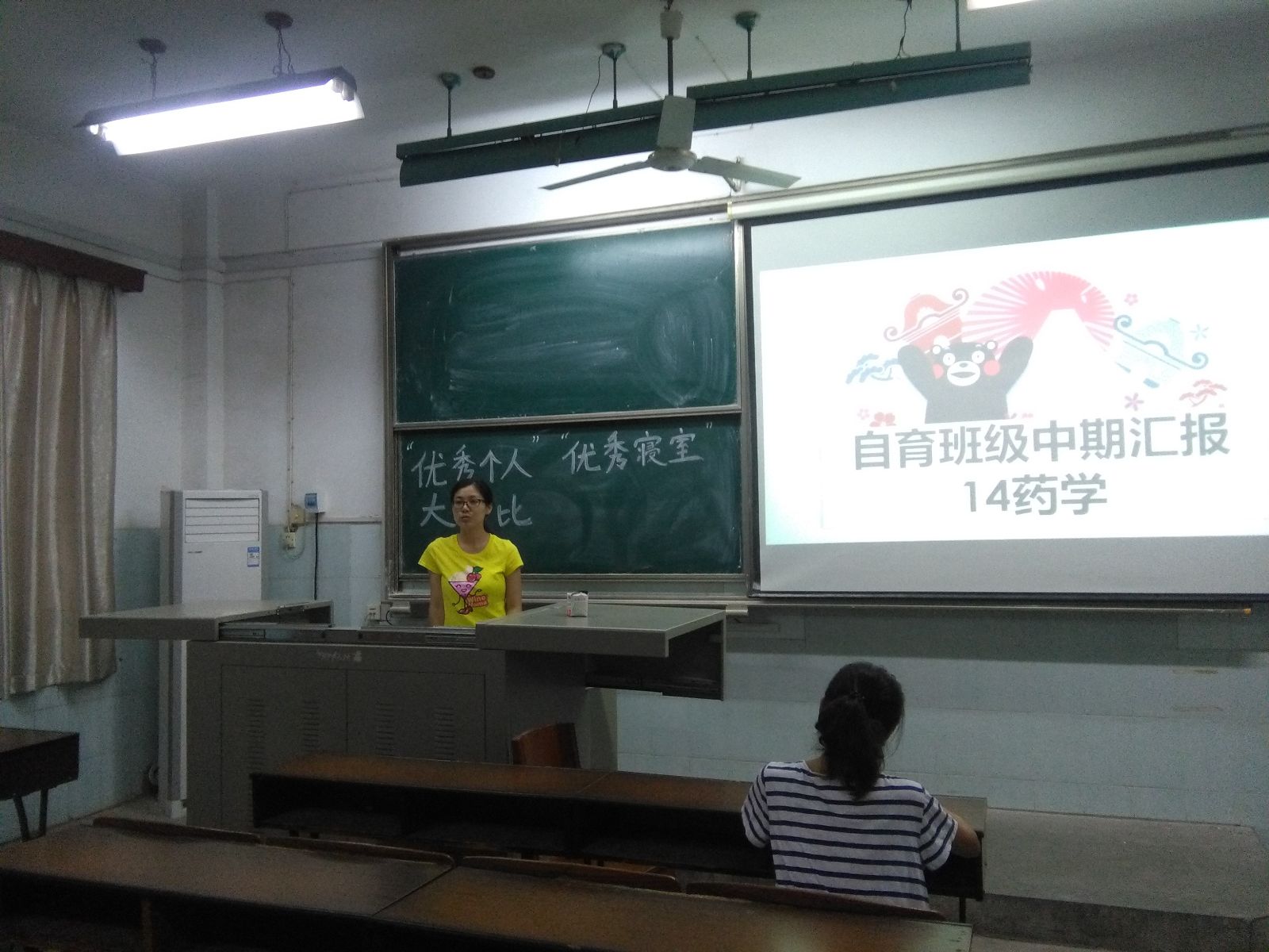 评选伊始,生科院辅导员马菲进行了讲话。她首先肯定了14级药学班同学在过去一个学期的成绩。她表示,自育工程是对自我、对班级素质和能力的全面提升,她希望同学们在践行自育的同时,也可以借鉴别人的经验,在相互学习的氛围中不断完善自身。随后评选活动正式开始。本次评选分为个人和寝室两个部分,通过打分最后评选出“优秀个人”和“优秀寝室”各一名。首先上场的是来自8栋的426寝室,他们通过一张张集体活动照片,展现出了温馨、和谐的寝室氛围。随后,102寝室特别的寝室制度令人眼前一亮,从健康到学习,从卫生到陪伴,让现场同学感受到了一个严谨却布满活力的大家庭。而106寝室的“达人归来”更是别具风采,生活达人、组织达人,外交达人...一个个性鲜活的成员,让人印象颇深。427寝室的“学霸”气氛让人感同身受,一张张优异的成绩单,成为了14药学班一面励志旗帜。