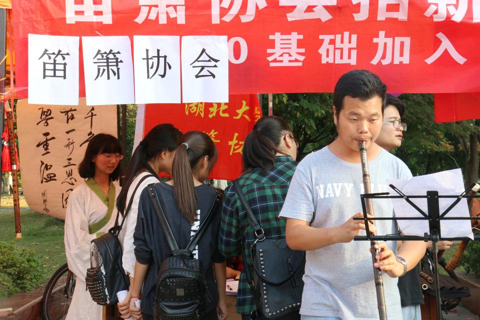 悠扬舒缓,古韵氤氲的笛声笼罩整个活动会场,这是笛箫协会的成员在组织表演。灵活的手指跳跃在小巧精致的乐器上,一阵阵动听的音乐便流泻开来,带给人视听上的双重享受。据该协会会长说,笛箫协会以引领大家走进美妙的音乐世界为宗旨,开办各种丰富的乐器比赛,致力于给整个校园带来一股文艺气息。走过趣味十足的生物知识普及协会,意义非凡的健康协会,令人赏心悦目的集邮与收藏协会,我们看到了毫不逊色的花卉社团。满目琳琅的花卉书签,美不胜收的花卉样品,在静静地召唤着来来往往的学生们。该社团会长何斐说:“花卉协会每年会定期举行菊花展,武大樱花之游以及‘妙手生花’花卉大赛等活动,我期待着花卉爱好者的到来,使花卉协会的队伍更加壮大。”看过吸人眼球的工艺美术协会,神秘优雅的魔术协会,富有磁性的男性嗓音伴随着悠长的音乐在空中荡漾,这是吉他协会在进行宣传活动,本次招新,他们除了吉他协会乐队,还邀请到了武汉理工大学吉他协会会长马博杨等四人和武汉音乐学院五位吉他及钢琴专业教师现场友情出演精彩的表演。美妙的音乐,引人入胜,来报名的人更是络绎不绝。