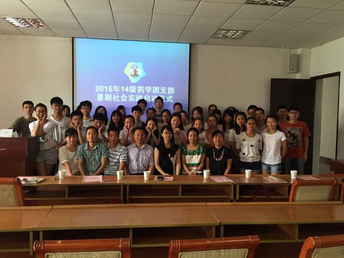 仪式由14级药学班班主任段瑾主持。活动伊始,药学专业主任杜鹏发表了讲话,他对现场的同学强调,要抓住现有丰富的资源,多参与像暑期社会实践类的课外研究活动,拓展自己的眼界,并衷心的祝愿本次暑期社会实践活动能够圆满成功。随后,生科院团委书记杜彬宣布14级药学团支部暑期社会实践活动正式启动。其后14级药学班团支书唐兰如同学通过一段精彩的PPT展示,展现了14级药学团支部在一年来在学习、生活方面取得的优秀成绩,并在最后提出了十个未来发展的目标。而后,本次暑期社会实践团队的队长刘纯同学为现场的老师和同学详细的介绍了本次社会实践活动的主题、形式和进行进程。她首先分析了国内外对过期药品回收的现状,通过实例和数据对比,显示出我国对药品合理使用方面的漏洞和缺陷,并延展出了本次活动“居民合理用药”的主题。与此同时,她介绍了团队的成员和活动的流程和形式。最后,莅临现场的各位老师在暑期社会实践团队的文化衫上签名,并表达了对本次活动的衷心祝愿。生科院党委书记吴文华也对团队队员进行了指导交流,给出了了自己的一些建议,希望大家力争将此次实践活动最大化的服务普通民众。