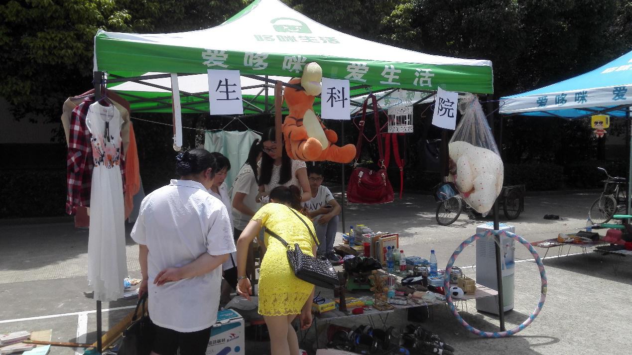 之前的一周生活部的干事们就已经对活动进行了详细的准备,收集了来自生科院毕业生们的许多物品,大到桌椅板凳轮滑鞋饮水机和玩具娃娃,小到戒指吊坠小公仔小钱袋。7点钟时我院的活动帐篷和待售物品都已就位,一位桃李园食堂的叔叔立刻买走了电风扇一个,这无疑是一个很良好的开端。后来天气渐渐炎热下来,客流量也在持续增加,但是这依然不会影响生活部同学们的热情,大家都忙着宣传、交易、记录,还要和来讨价还价的顾客们慢慢解释我们是在按照毕业生们的定价卖东西,并没有权利来降价。
