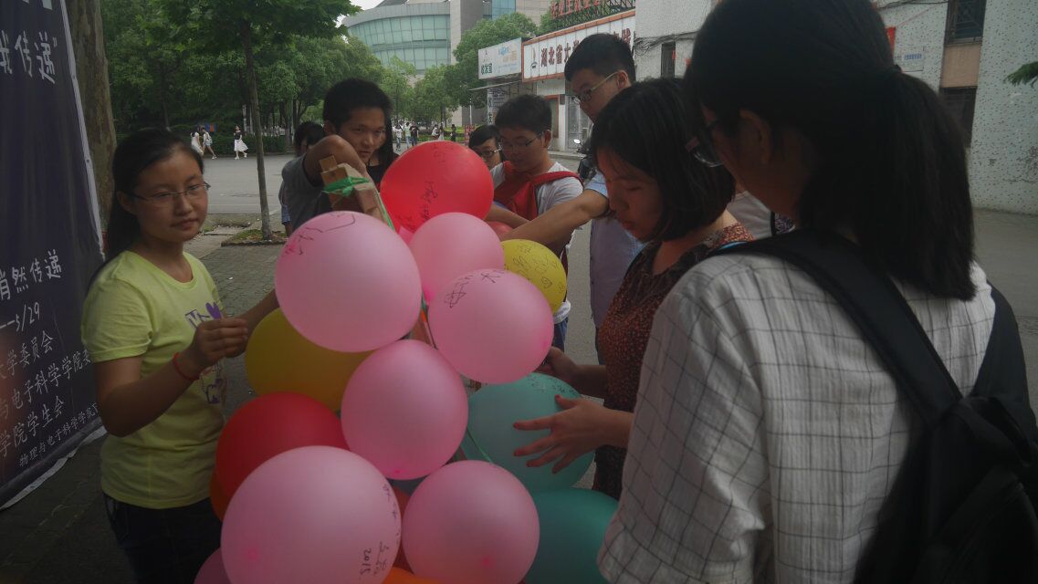 志协的志愿者们通过喊口号方式吸引同学们参与活动,参与的同学将自己对母亲要说的话写在气球上,或者写在便利贴贴在气球上,所有的气球都挂在一根绳子上。等摆点结束后会由志愿者挂到大活旁边的2号体育场栏杆处,并挂上小彩灯。而在晚上则会将彩灯点亮。此外,在摆点过程中还会选取一些同学说几句对母亲要说的话,拍成一段小视频在微博上展出。活动过程中,一个5岁的小朋友也被一串五颜六色在风中飘荡的气球吸引了过来,还不会写字的他,用心地在气球上画了一个大大的心。