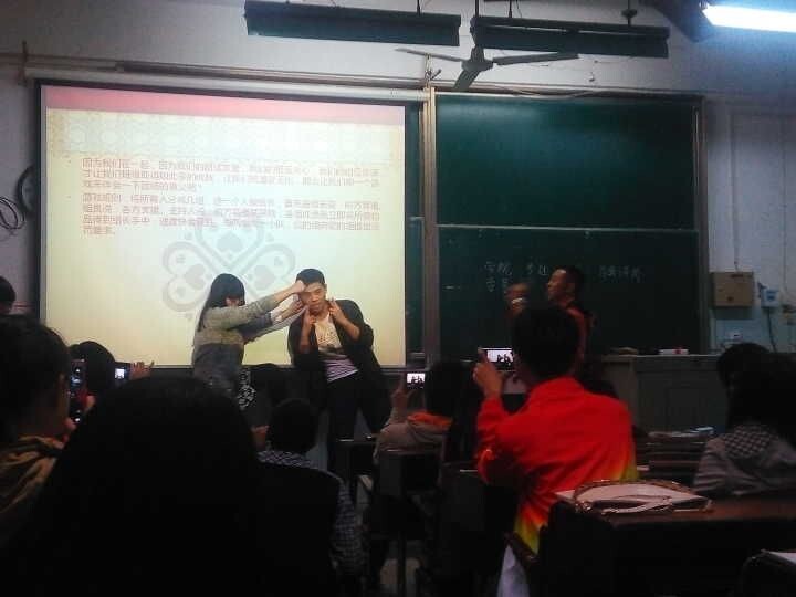 班会开始前,举办此次班会的寝室成员将该班学生引至特意被打乱的座位上。班会开始,她们首先通过PPT放映同学们在平时生活中的照片来引进主题。随后通过游戏环节来加深同学们的感情。游戏环节分为两个部分,一个是“你来说,我来猜”,另一个是“前方有难,后方支援”。其中的“前方有难,后方支援”是将该班同学分为两组,各选一名队长。队长在前面喊“前方有难”,队员齐声回答“后方支援”,主持人则随后读出任务物品,这时队员们留在原位通过传递的方式收集物品给队长,哪一队先收集完就胜出。游戏中主持人念到五根皮带时,只见各位队员毫不犹豫的抽出皮带向前递,现场气氛十分活跃。最后失败方接受惩罚则是将游戏推到了高潮,班长谭豪对班主任李俐老师的深情告白让同学们狂笑不止,团支书王佩的卖萌动作的五连拍展现了女孩子可爱的一面,班会在欢笑声中结束。
