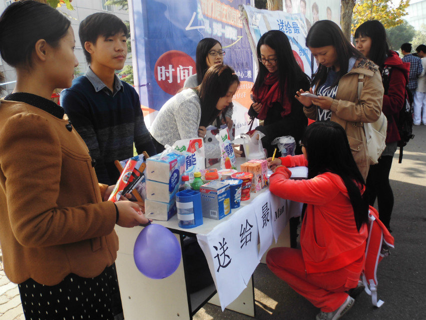 从2007年至今,每年男生节前夕,生科院都会开展不同主题的活动。今年的活动更是如此,直到摆点第三天还能看到现场火热的状况。还未靠近展示桌就能听到工作人员卖力的宣传声,有的负责吸引学生,有的负责介绍活动规则,有的负责清点礼物。参赛的礼物多种多样,不仅有书、象棋、项链等常见的礼物,更有许多富有特色、创意的礼品。有与同学追忆在啤酒厂共同实习快乐时光的啤酒,也有代表与朋友分享自己认为好的东西的零食。