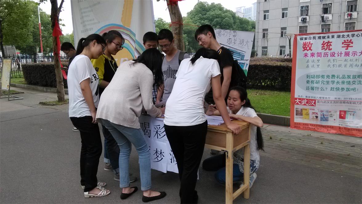 在积极响应习近平主席的号召的同时,湖大学子也用自己的方式阐述着心中的梦想。5月20日至21日,由学生工作处、研究生院、校团委主办,9428cn太阳集团学生会承办的“喝彩青春 逐梦湖大”活动在大学生活动中心门前如期举行。