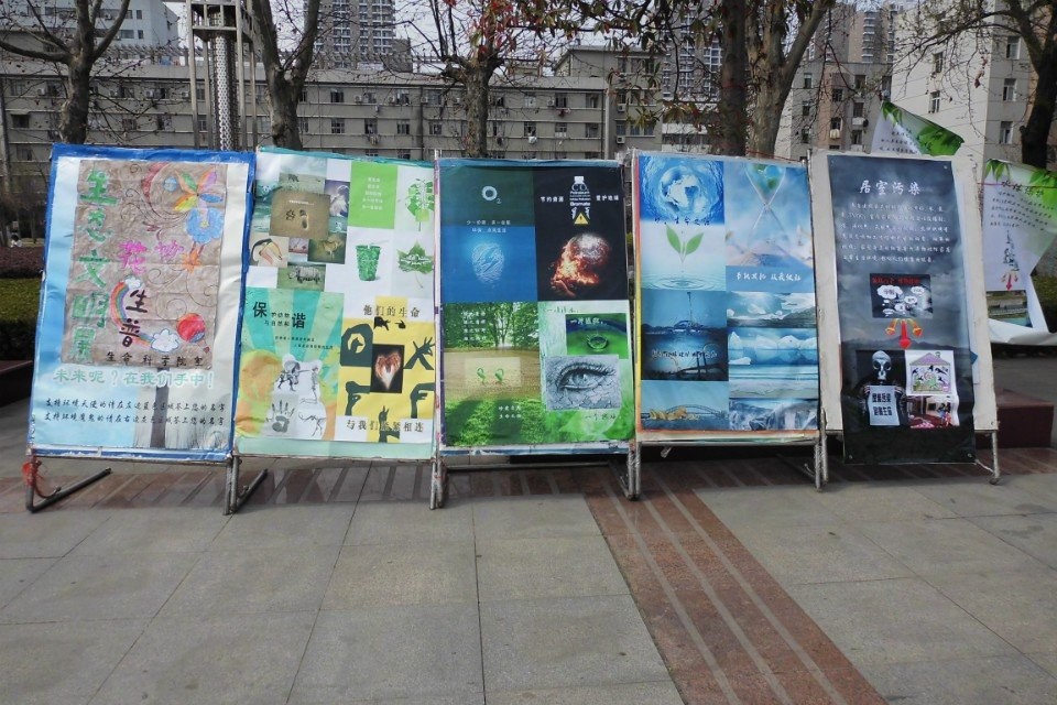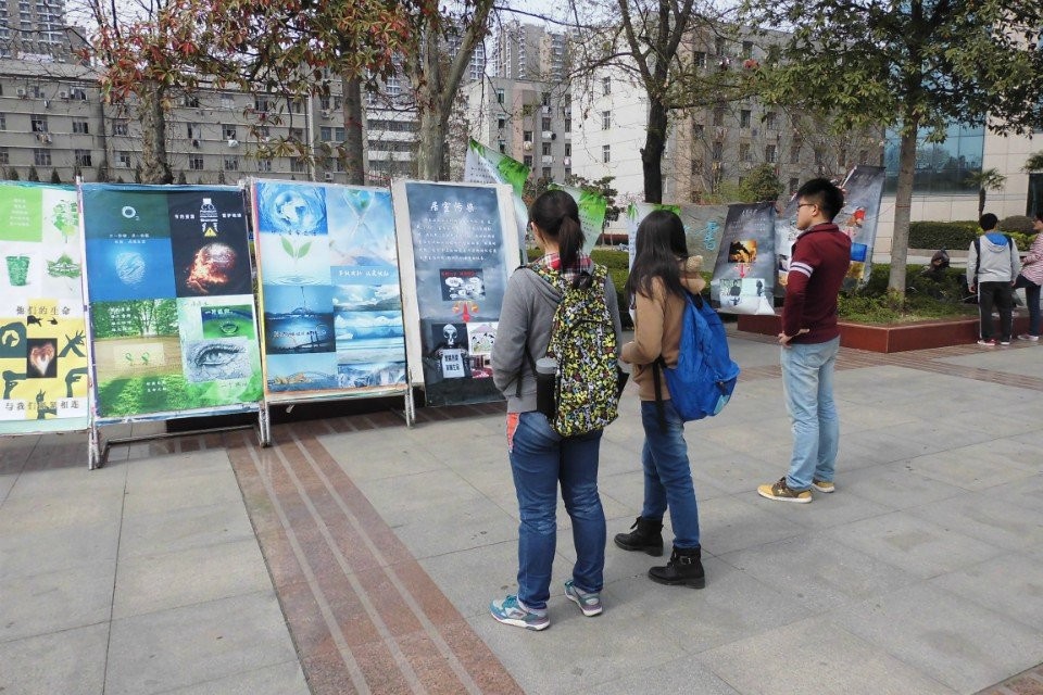 活动展出了大量的海报与展板,向大家普及了许多人与自然、人与动物之间的知识。“辽阔的草原上奔跑的花豹、与人类男孩亲吻的海豚、眼含希冀的犀牛、由叶片构成的纸杯和手提袋、荒芜的土地上长出的绿芽、干涸的地球……”每一幅图片都引人驻足。生普协会会长向兴峰对此介绍说:“我们希望用这些图片告诉大家大自然的一切都是与我们息息相关的,我们要爱护珍惜大自然。”在主题为“居室污染”的这幅图前,有位同学发出感慨道:“我原来还以为所谓‘居室污染’就是指装修时甲醛的污染,现在才知道家用电器和家养宠物都会带来居室污染啊!”