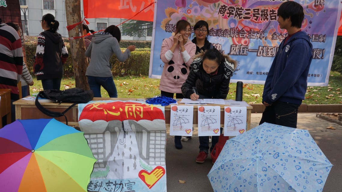 对于此次开展的爱心雨伞活动,大多数同学都认为它很有意义,很是支持,纷纷捐赠出自己用坏了的伞或者长期不用的伞。陈沙同学说出了自己的心声:“本来也是一把闲置的伞,与其放着,还不如拿出来帮助别人,这样伞的存在也更有意义,这不仅帮助了别人,也帮助了自己,谁没有个忘记带伞的时候呢?”