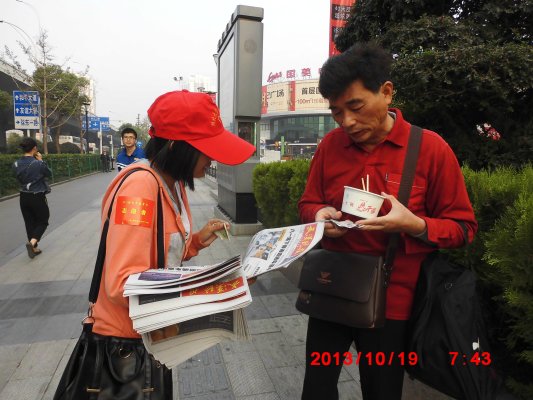 在路上志愿者们遇到人就勇敢上前询问:“请问需要今天的报纸吗?如果你买一份报纸,你就可以帮助那些需要帮助的人,为慈善事业做出一份贡献。”志愿者们用这样真挚的话语,成功地打动一个又一个善良的人,卖出一份又一份报纸。还有不少的路人看到贴有志愿者标志的“小红帽们”,主动拿出零钱来买报。其中有一对老夫妻说:“尽管家里已经定报纸了,但看到是志愿者们大早上来卖报纸为慈善事业做贡献,还是决定买一份,这一群孩子都这么有爱心,我们更应该有!”